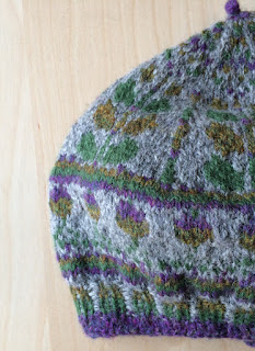 ご存知Kate Davisさんのデザインした帽子。地色に3色を配し、キュートな「球根頭」が描かれています。色違いでも編みたい、と2 パターン準備しました。