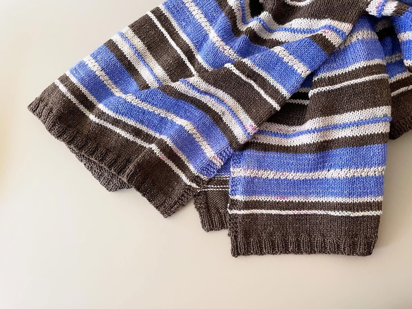 ボトムアップの往復編みで、それぞれのパーツをとじはぎして完成させる。前開き部分にボタンをつけても。