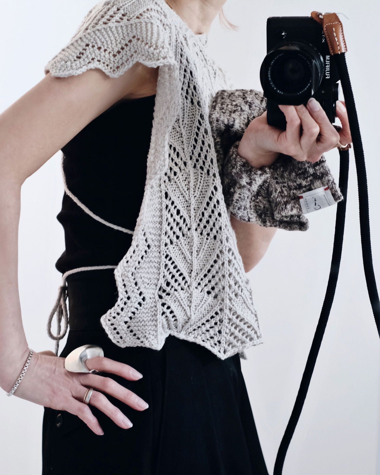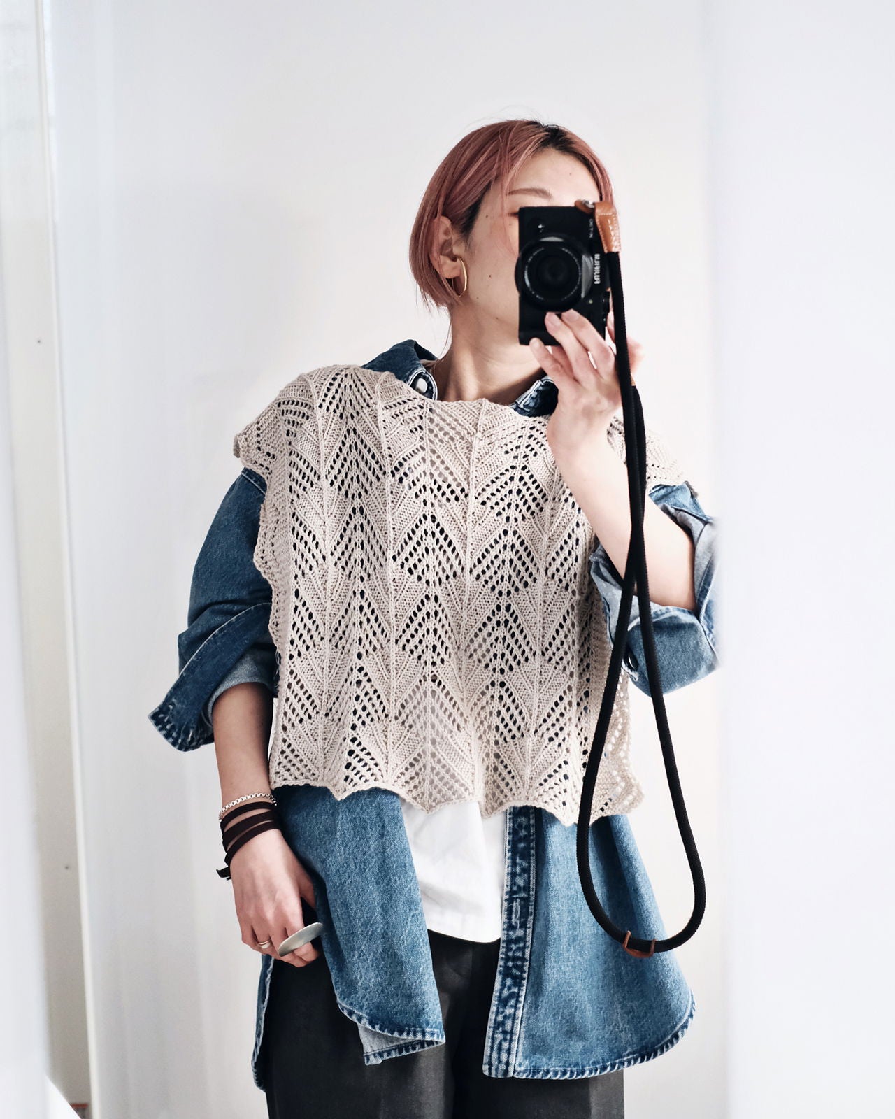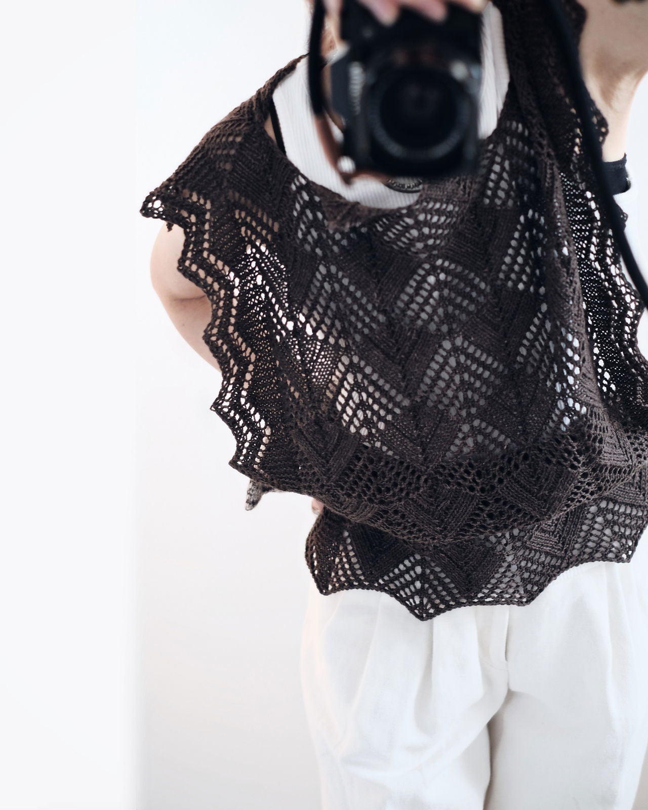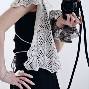 1カセ以内で編むために、先にストラップを2本編んでおく。後ろ身頃の裾からCOし、肩のラインまでレース模様で編んだら、BOとCOでくり抜くように首あきを作り、引き続き前身頃もレース模様で編む。前身頃は残りの糸を全て使用できるので、お好みの丈になるまで編んだらBOし、ストラップを縫い付けて完成。