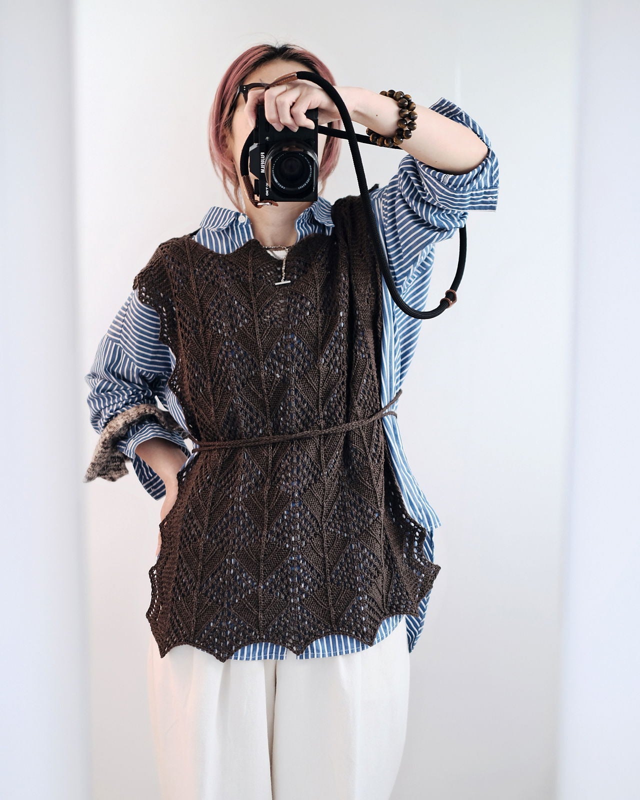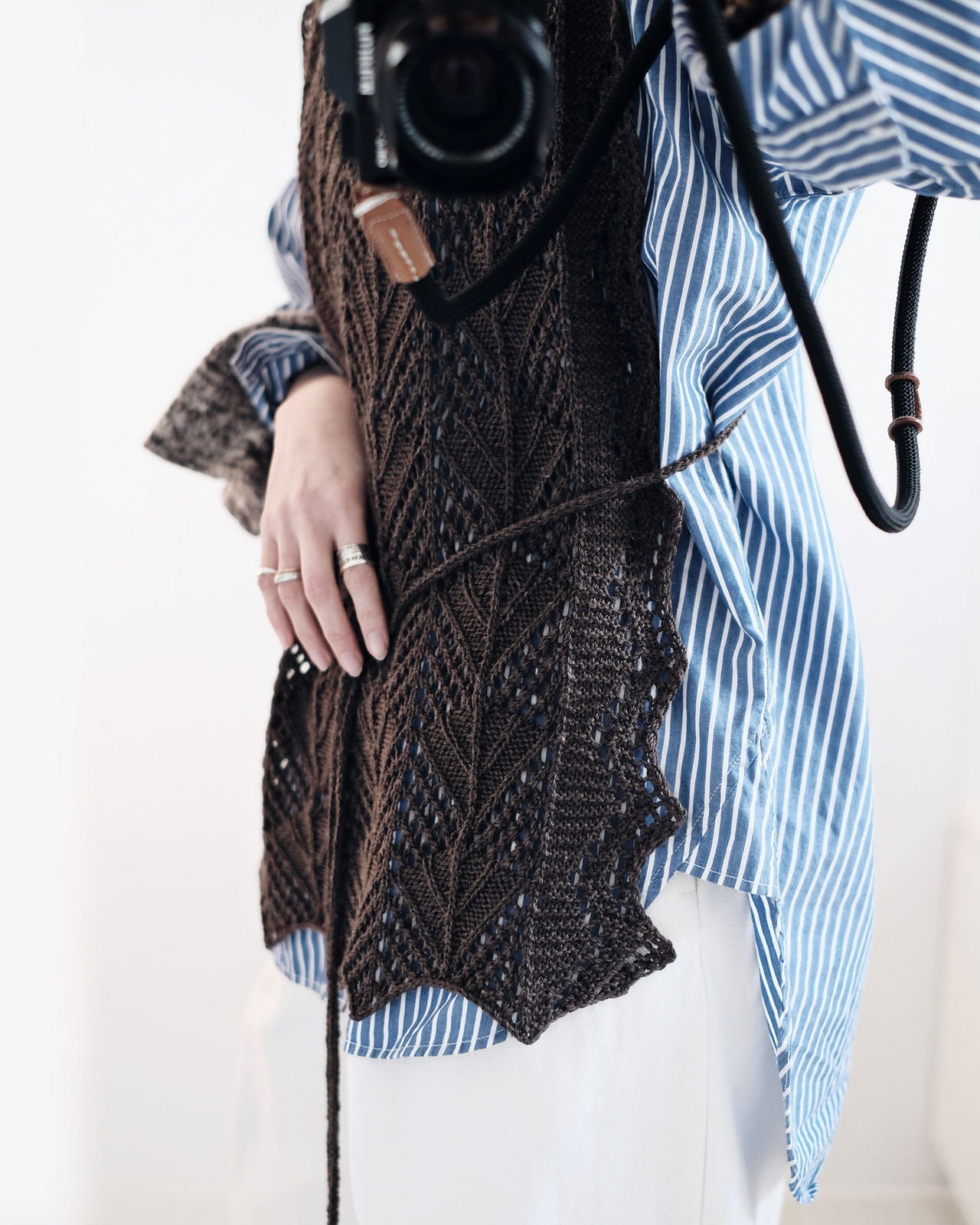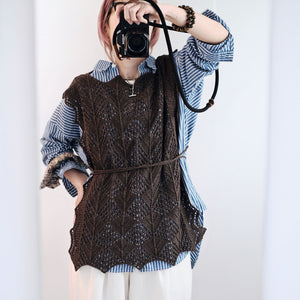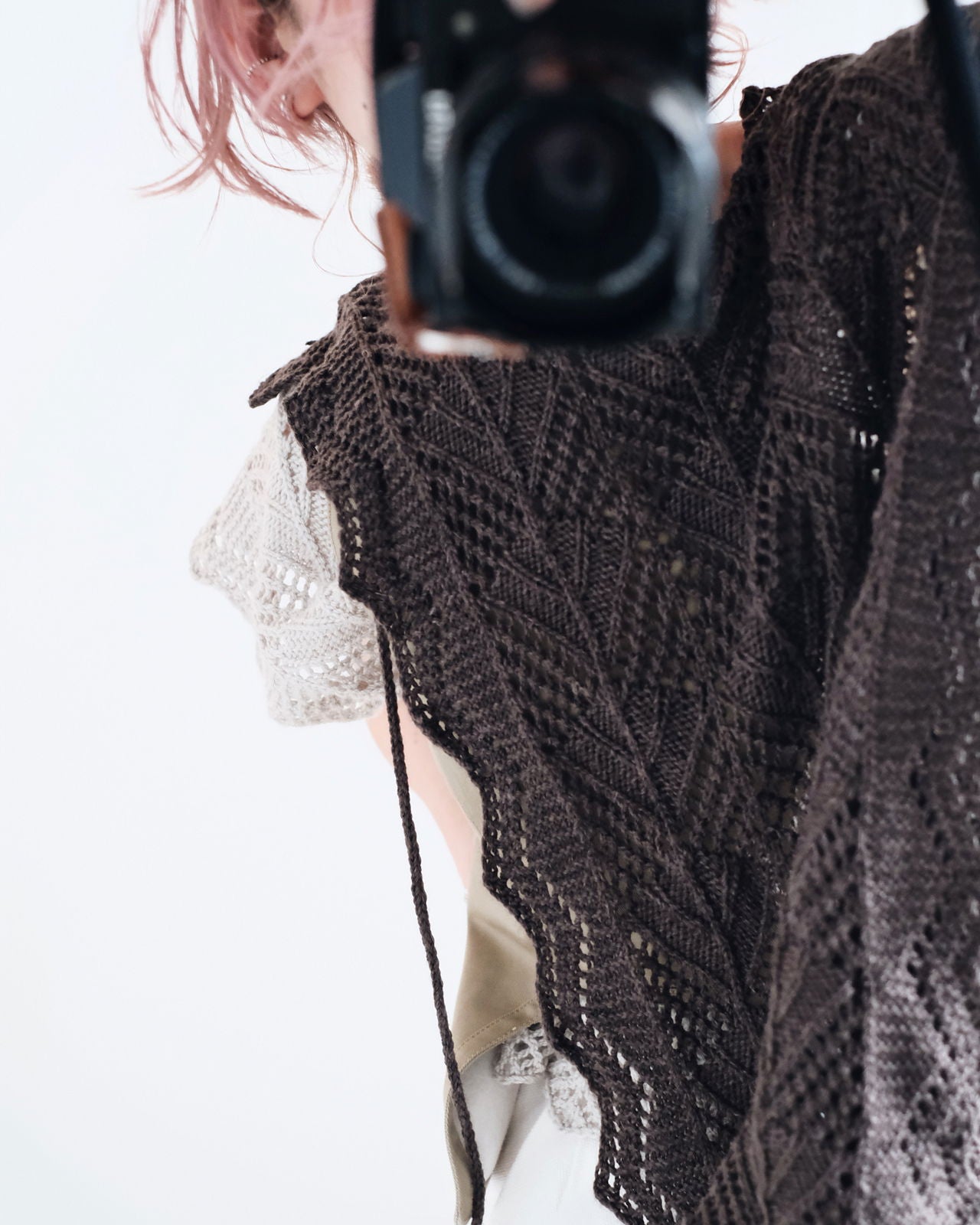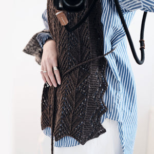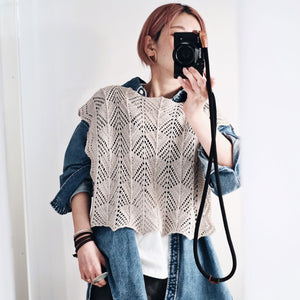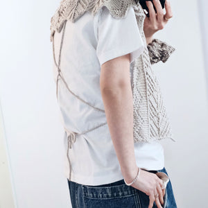 NOME ノーム は、全面にレース模様を施した、プルオーバータイプのサマービブ。後ろが開いたベストのように着るものですが、肩にかけたり、腰に巻くこともできます。どんなお洋服にも合わせられて、紐の使い方でも印象が変わるので、コーディネートは無限大。サンプル使用糸のamirisu Paradeでキットをご用意しました。