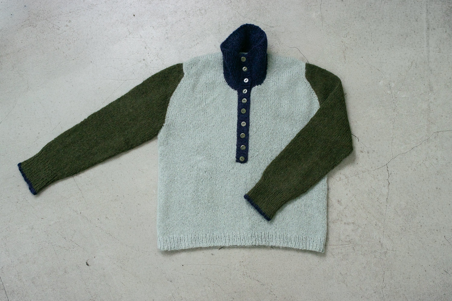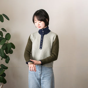 襟のボタンは開けても、上まで留めてタートルネックにしてもOKです。袖は色を替えてインターシャで編んでいますが、難しければ単色にしても。