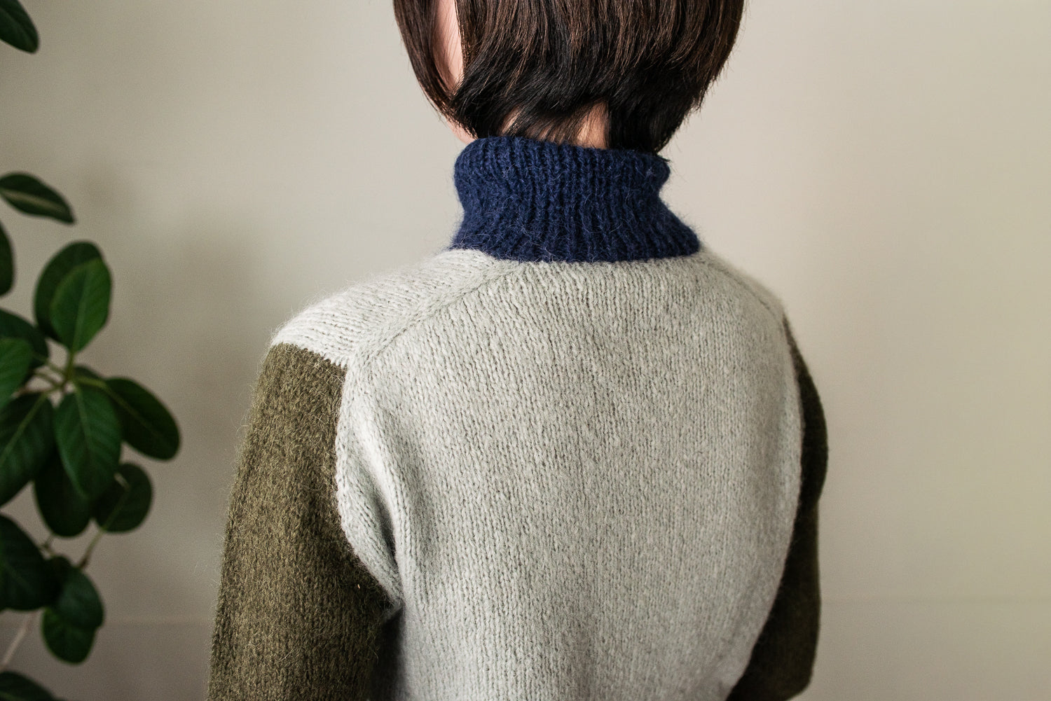 後ろ身頃上部を編み, 肩の目を拾い, 肩を編む. その後、肩の両端に沿って袖の目を拾い, すべてのパーツをつなげ, とじはぎなしのヨークを編み始める. 色替えをした袖にはインターシャの技法を用いる場合, 袖の拾い目から下を配色糸で編む. とじはぎなしのヨークを編んだら, 身頃を編む間, 袖の目を休めておく. それから袖を編む. 襟と前立ての目は後から拾って編む. 襟ぐりはヘンリーネックで, ボタンホールも編む.