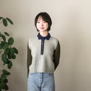 色使いがキュートな長袖ポロシャツ、Amelie。amirisu Flutterで編むので直接肌に触れても柔らかく、Cocoknitsメソッドのおかげで肩周りのフィット感も抜群。