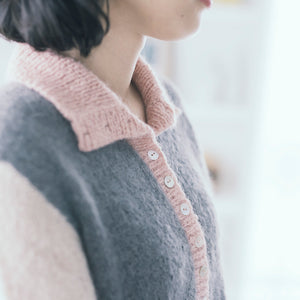 skin, and thanks to the Cocoknits Method, the fit around the shoulders is excellent. The collar can be worn open or buttoned all the way up for a turtleneck look. The sleeves are worked in intarsia with contrasting colors, though they can also be knit in a