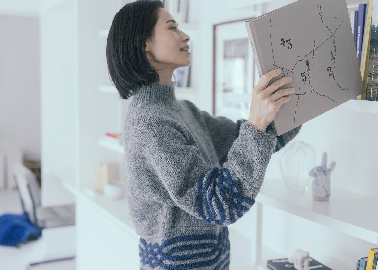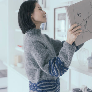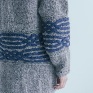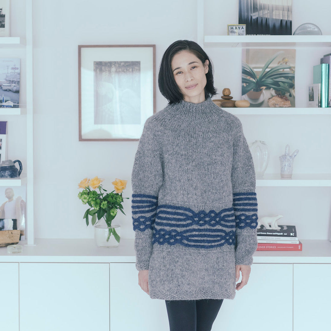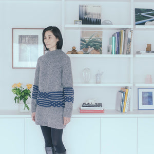In Korean, Gori means “cable” or “connection.” True to its name, this striking piece features bold horizontal cable panels, creating a garment wearable as a tunic or mini dress. It is stylish yet very warm, making it the perfect companion on cold days. Pair with tights, pants, or a belt to explore different looks.