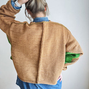 For this cardigan, knit the left and right body pieces and sleeves separately using intarsia from the bottom up, then bind off. Knit the front and back body pieces on each side up to the armpits using back and forth knitting, then separate the front and back and knit each piece up to the shoulders. For the sleeves, pick up the stitches from the armhole and knit back and forth using intarsia. Sew off the center of the back body, sleeves and shoulders.