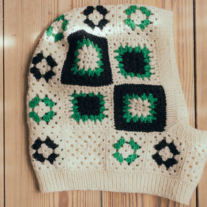 This hood is crocheted in two styles of squares, which are then seamed together. Stitches are picked up around the face opening and around the neck opening, and knitted ribbing is worked in the round. Puff Stitch and Granny Squares are worked in rounds with RS facing.