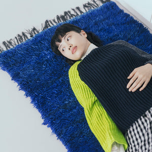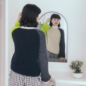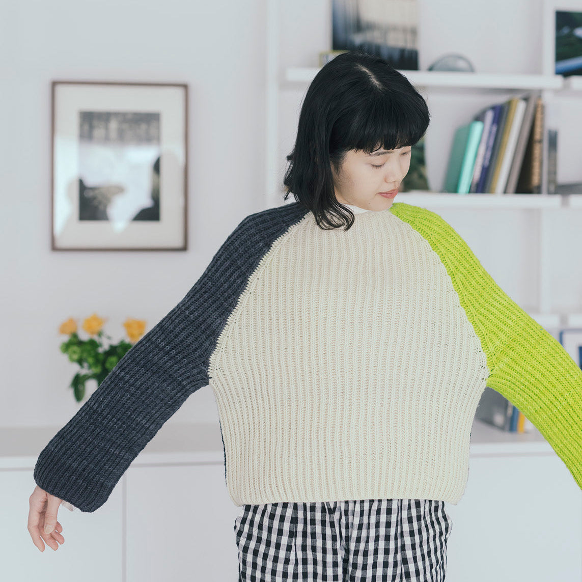 A playful raglan sweater with color changes on the lines of the raglan sleeves. The sweater is knit in the round using the intarsia technique, and the rhythm from switching the yarns feels like a ball tracing an arc across a tabletop. The sweater is fully reversible front to back, so you can choose which color to wear on the outside depending on your mood.