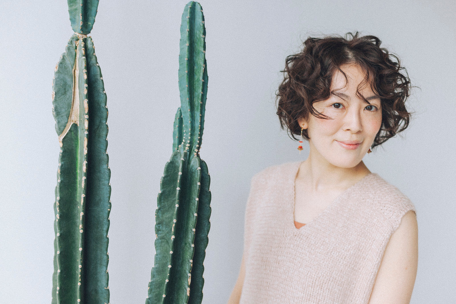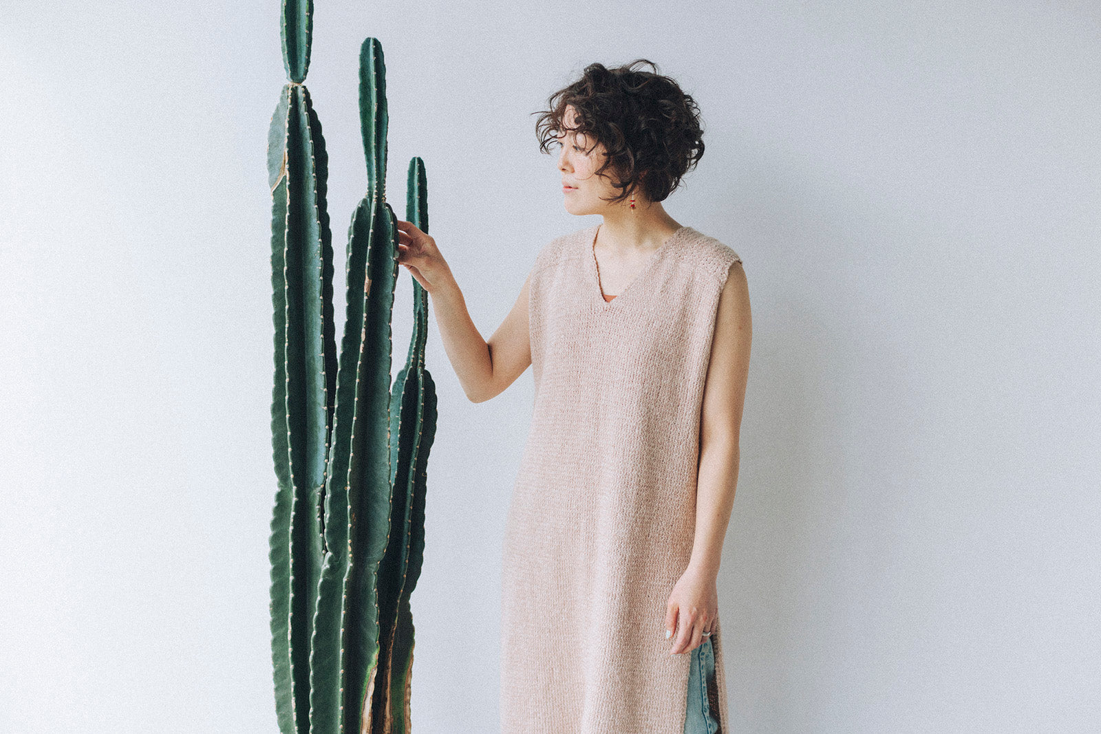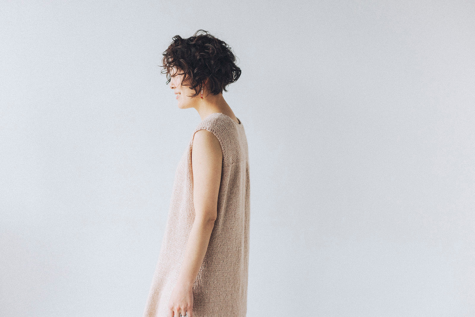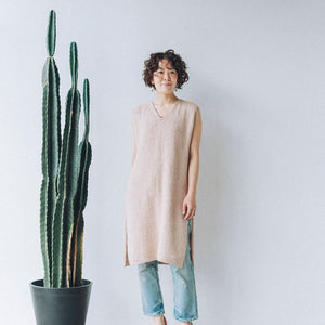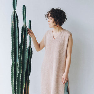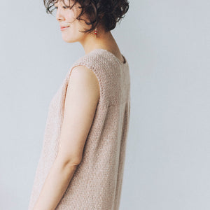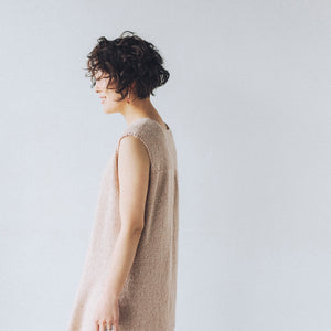 It has a very well-balanced design with a change in the knitted fabric on the shoulders, a moderately open V-neck, and a long slit. It can be worn sleeveless or layered over a shirt for a beautiful look. The two types of woolfolk STRÅ knit fabrics are beautiful and sway with every movement, like the flow of water or wind.