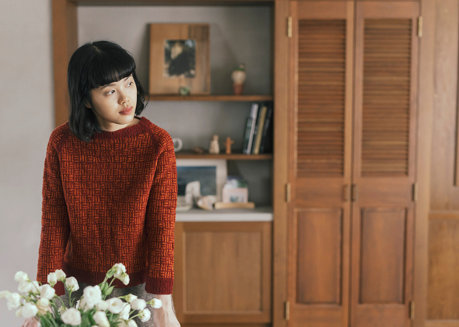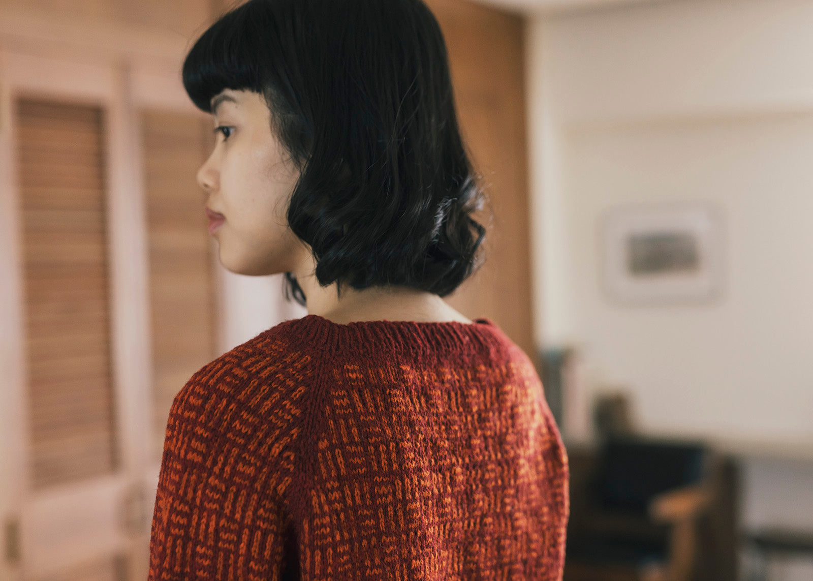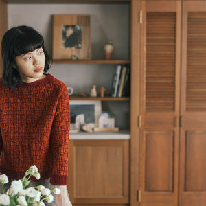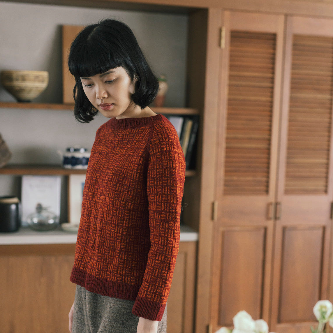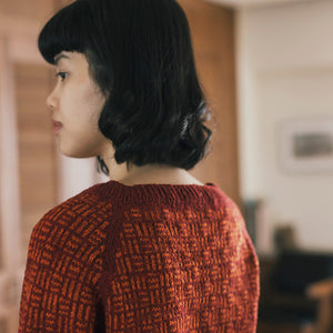 A raglan pullover inspired by the traditional Japanese motif Mitsukuzushi (“three breaks”). The interplay of A raglan pullover inspired by the traditional Japanese motif Mitsukuzushi (“three breaks”). The interplay of two colors and the wavering lines in the pattern add depth to the fabric, while the shallow boat neck has an two colors and the wavering lines in the pattern add depth to the fabric, while the shallow boat neck has an airy elegance. Enjoy experimenting bold contrasts or vivid color combinations.