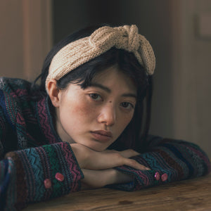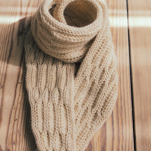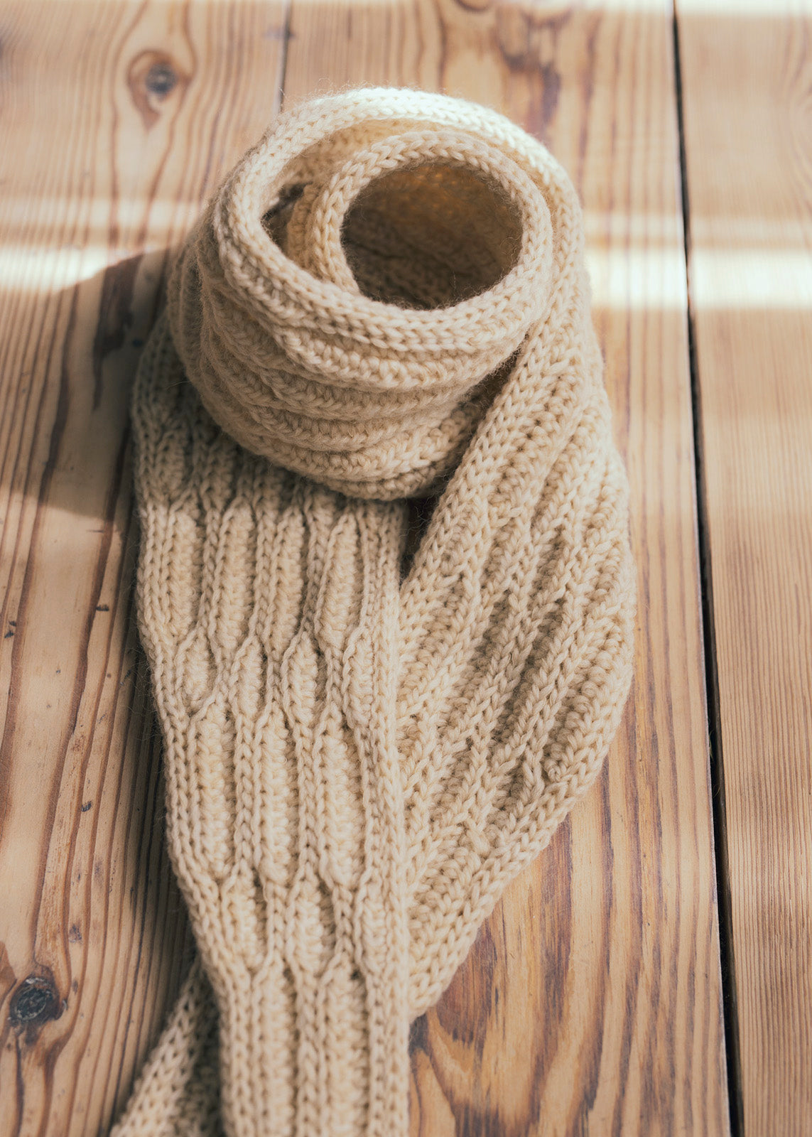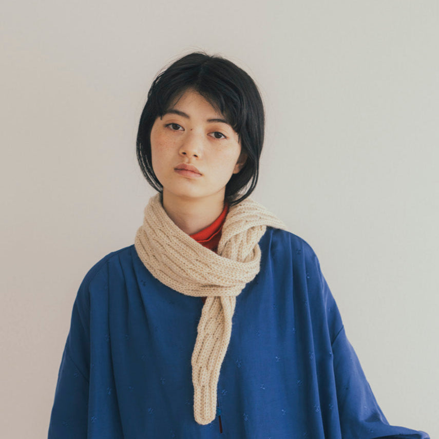 A thin scarf that can be quickly wrapped around the neck when it's cold. It's also excellent as an accent for your outfit. It was inspired by the beautiful texture of fishing nets and practical accessories that are essential to life by the sea.