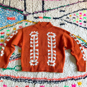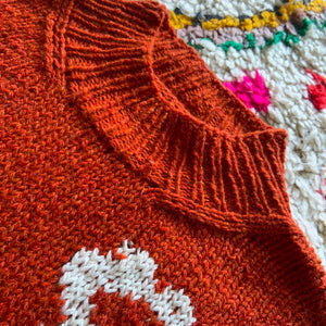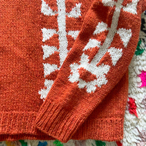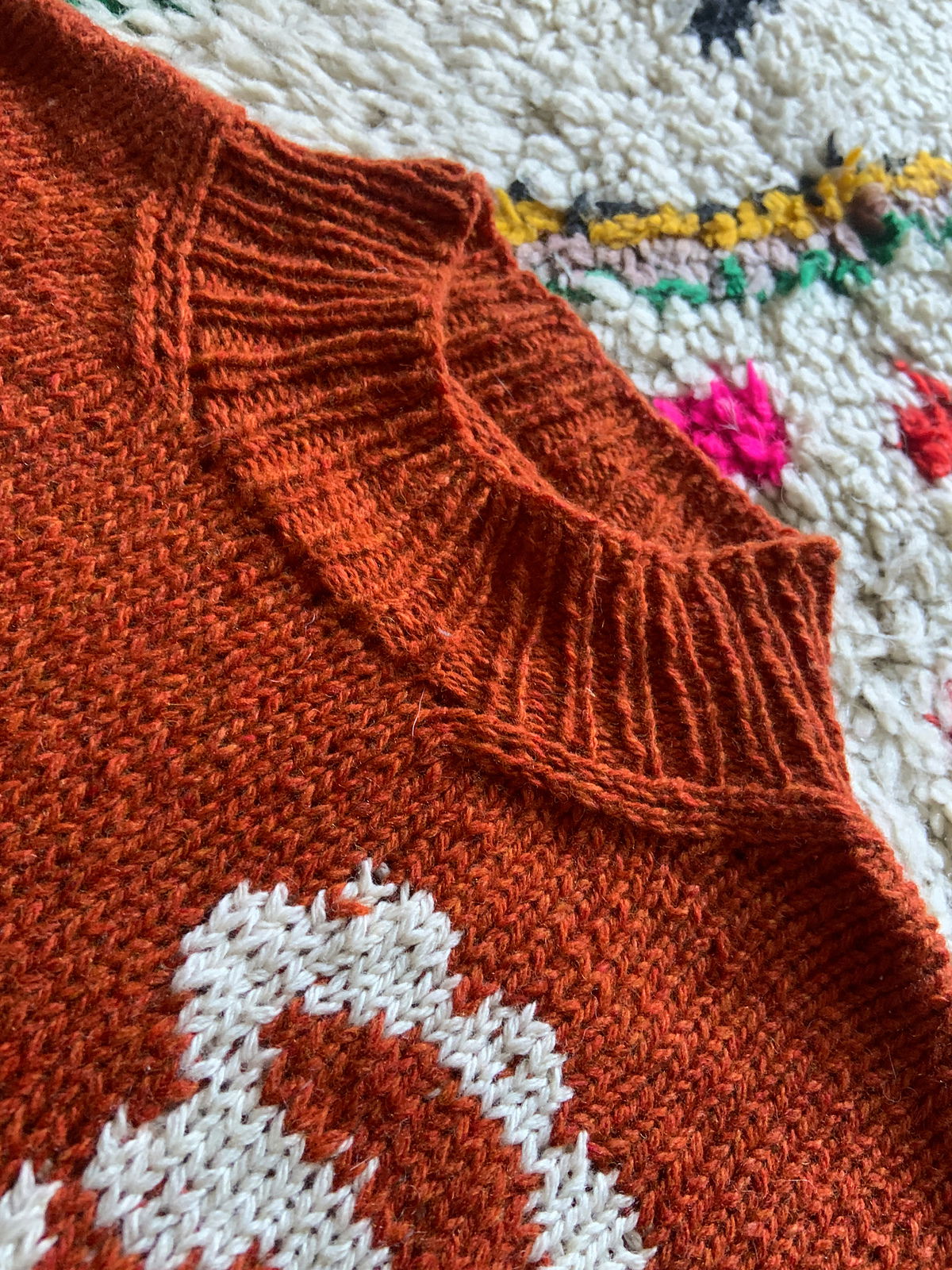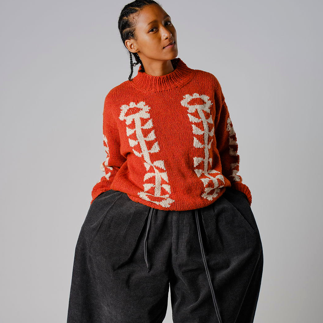 パーツごとにボトムアップで編み、編み込みをインターシャの方法で編む。 前後身頃を編み終えたら、肩をはぎ、袖を編む。その後、脇と袖下を綴じたらネックを編む。
