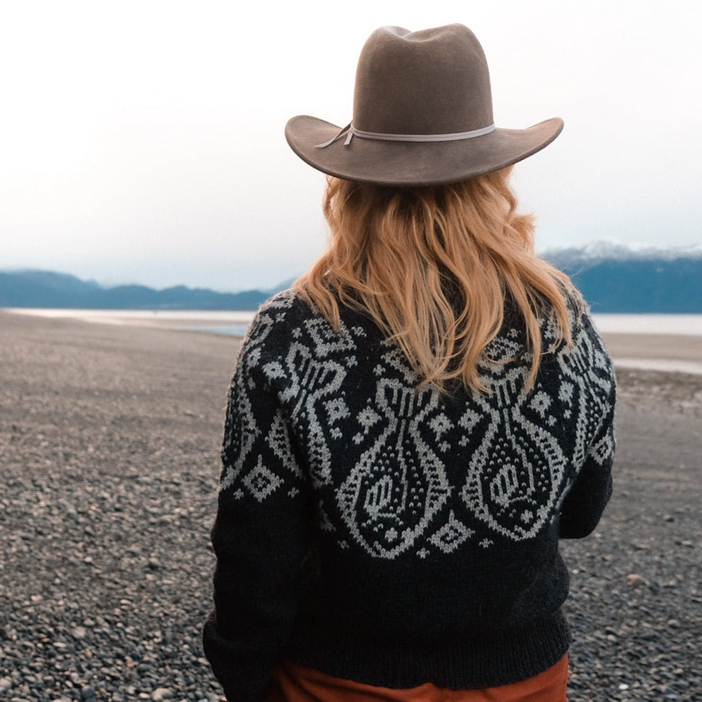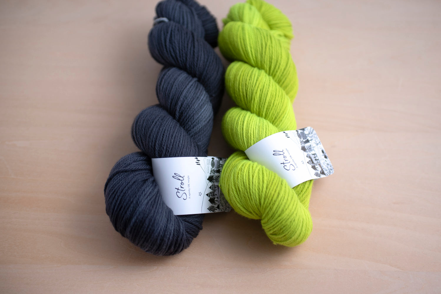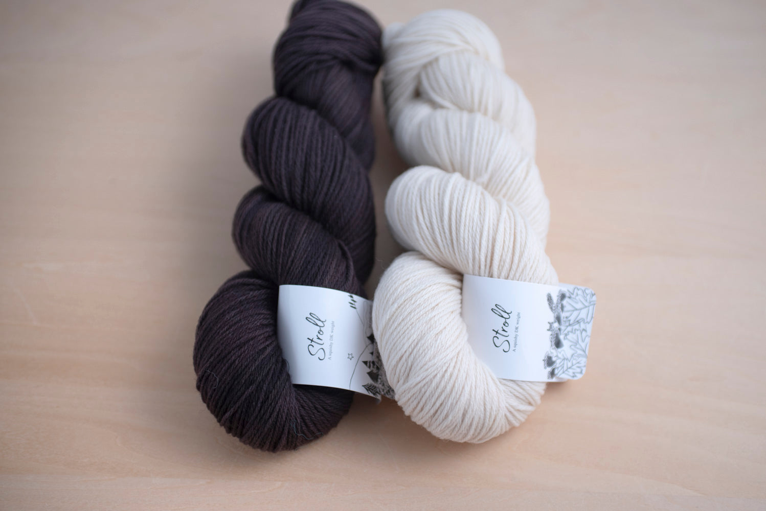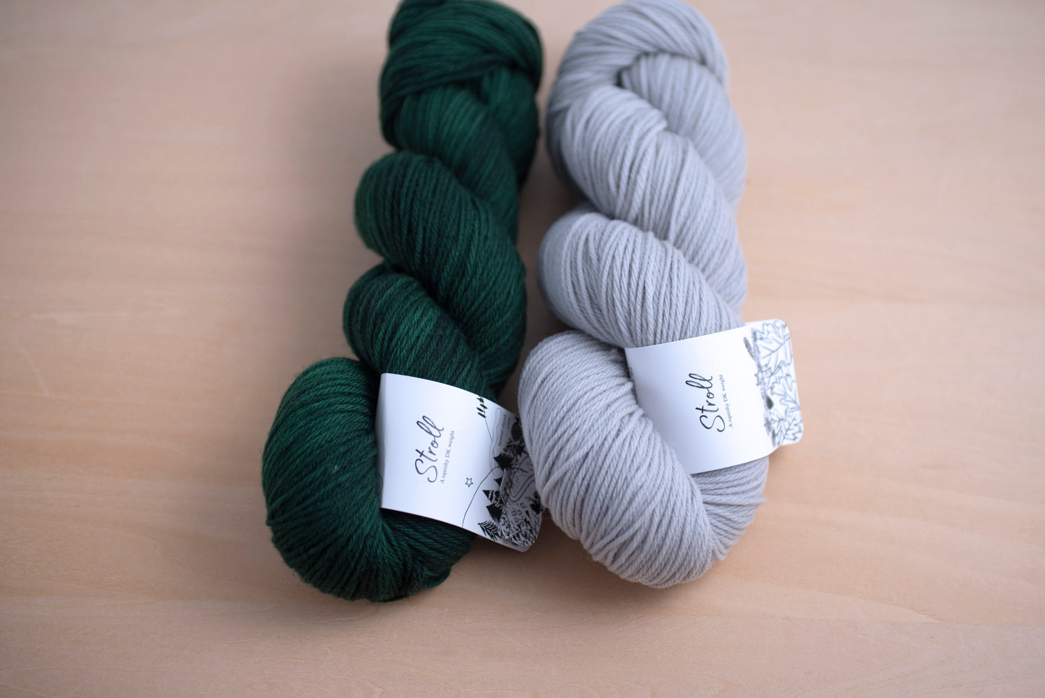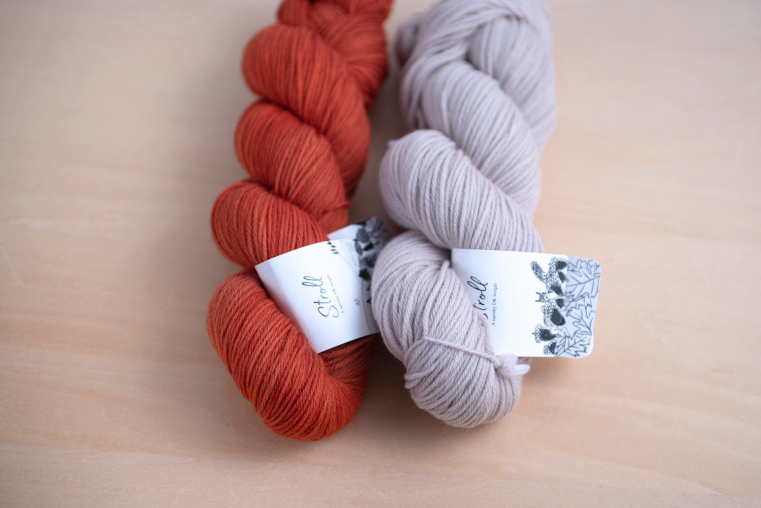 お魚がこんなにスタイリッシュなセーターになるなんてびっくりです。きらめく菱形の模様も配置されておしゃれに着られます。伸縮性があってふかふかのStrollで編めば、編み込み模様も編みやすく、コクのある色合いがぴったりです。