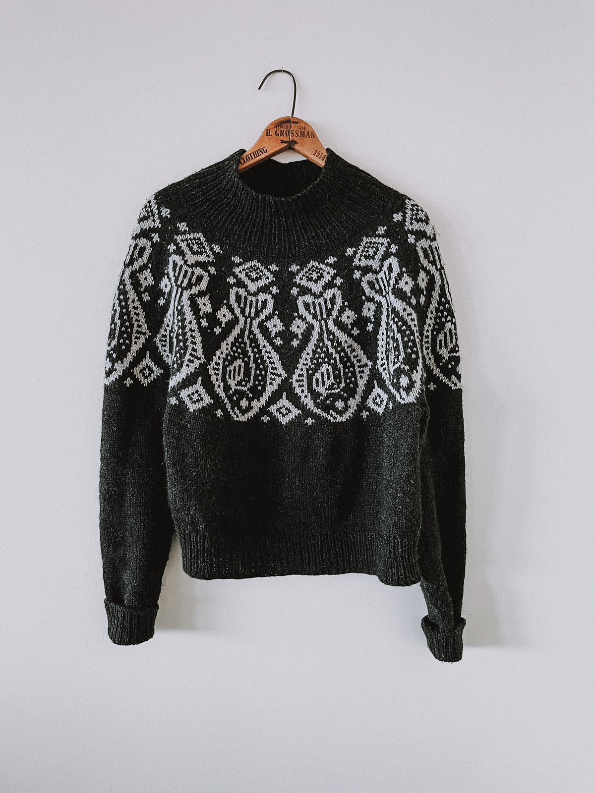 輪で編むトップダウンのカラーワークのヨークセーターです。首回りはタートルネック, モックタートルネック, クルーネックから選ぶことができて, 袖や身頃の丈はお好みの長さに編むことができます。