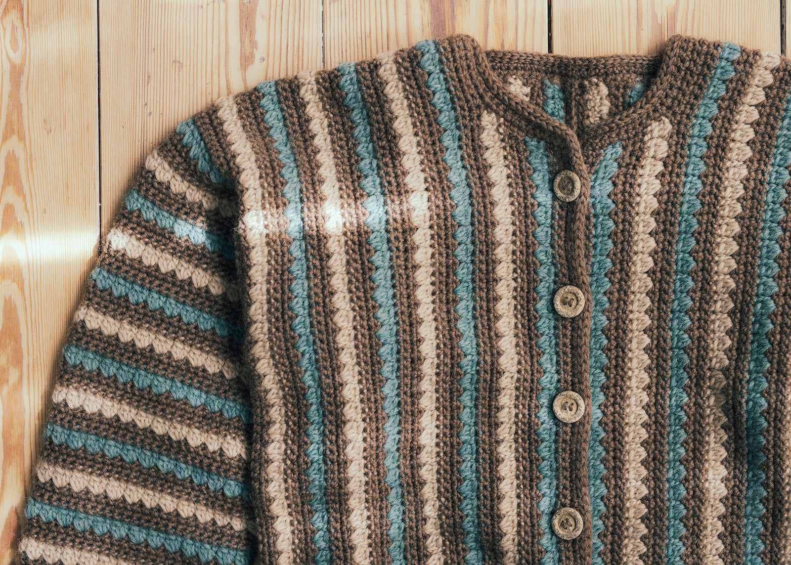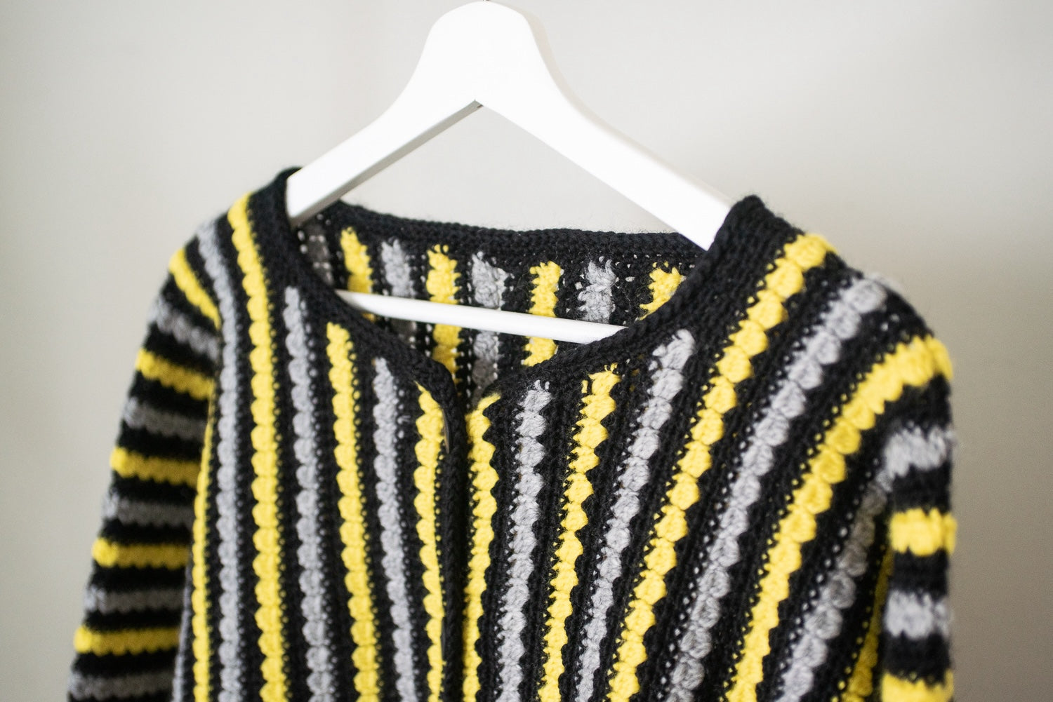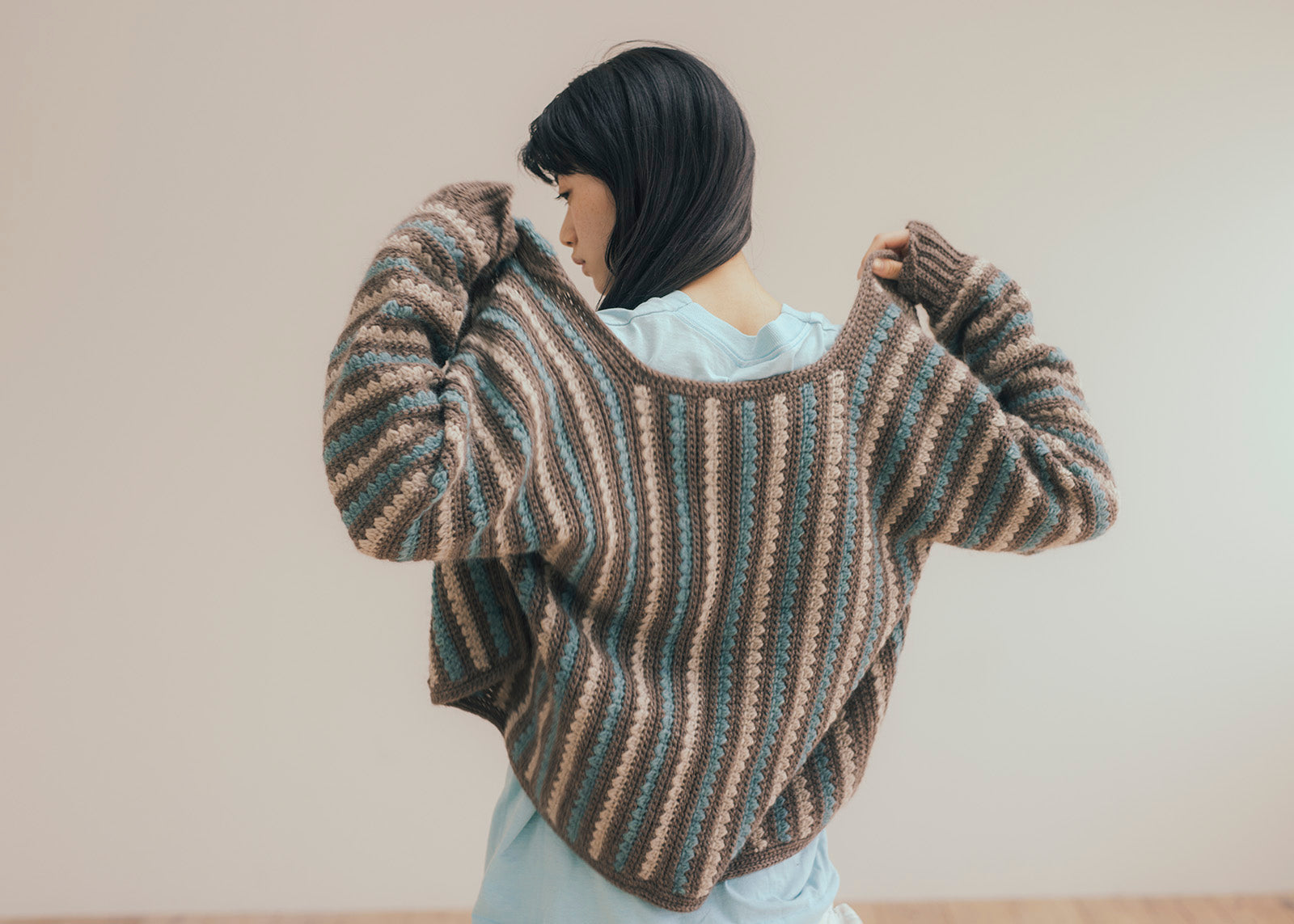 Kant is a cardigan with outstanding design of three-color stripes. The textured fabric, characteristic of crochet, is adorable.