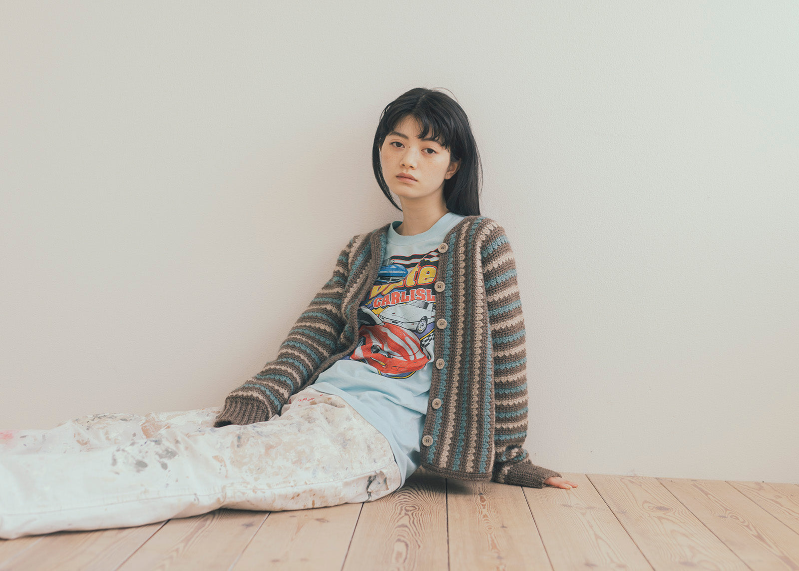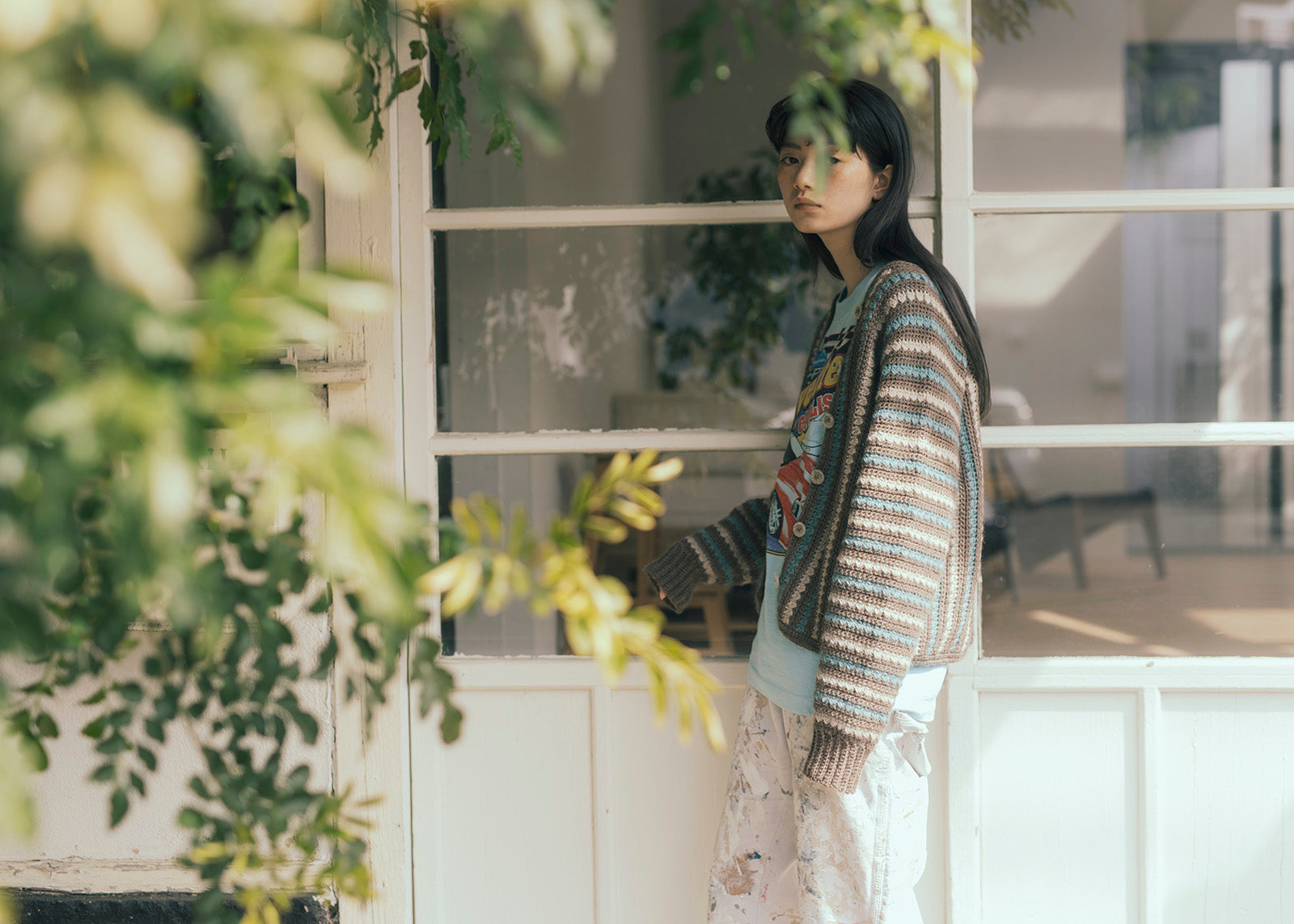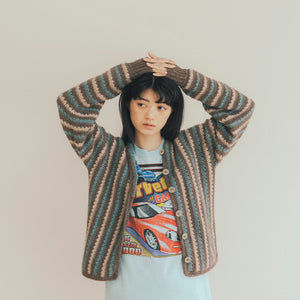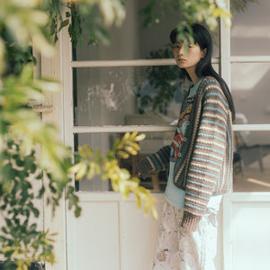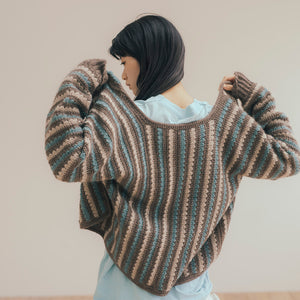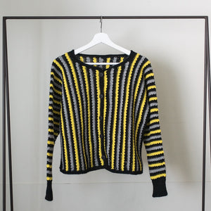 Kant is a cardigan with outstanding design of three-color stripes. The textured fabric, characteristic of crochet, is adorable.