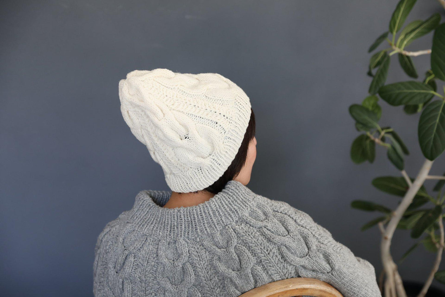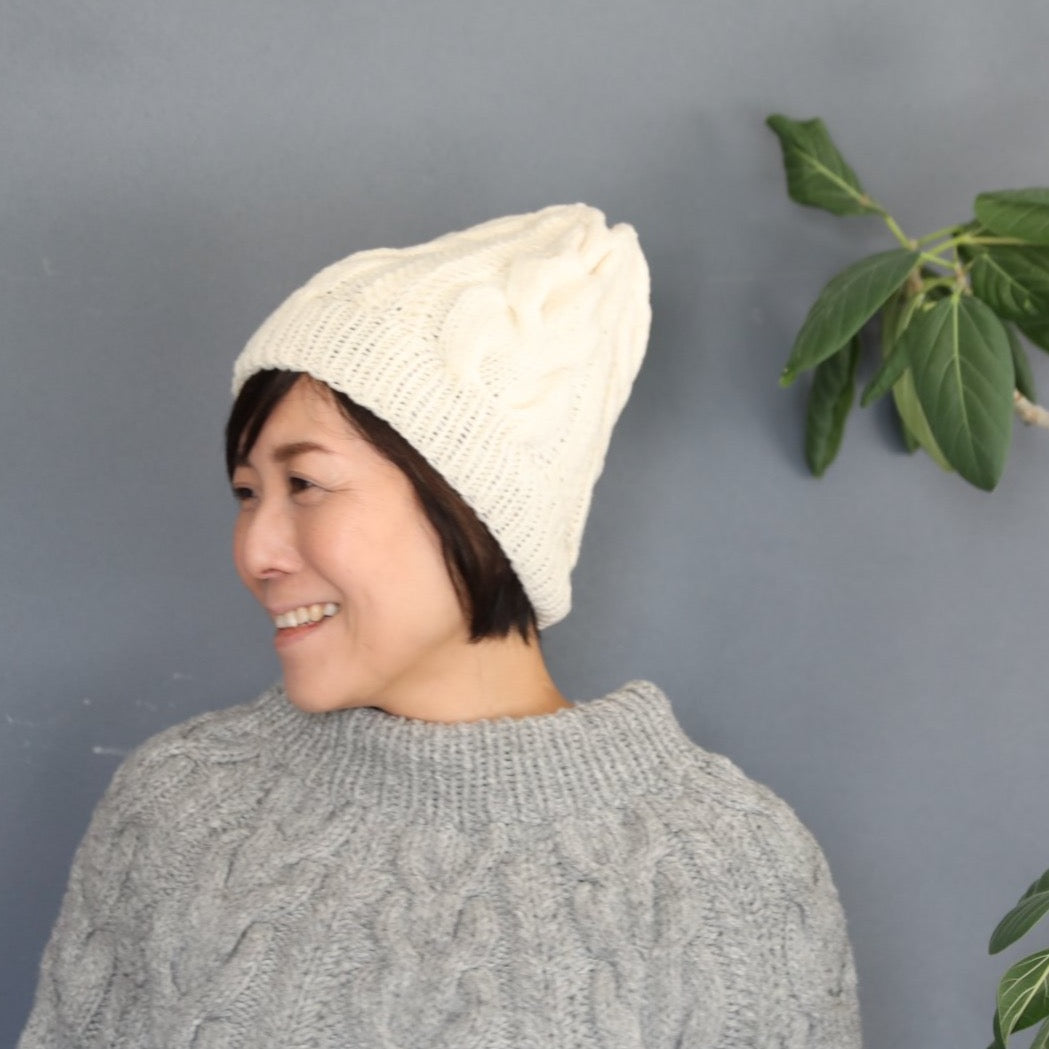 The cable pattern and the form that pops up are cute, but the flower pattern that appears most at the top. The ends of the cables gather at the top, and when viewed from directly above, it looks like a flower with four petals.