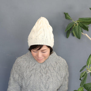 Start with the ribs around the head and work your way up, reducing stitches. Make a reduction stitch in the cable knit so that the reduction stitch is not visible.