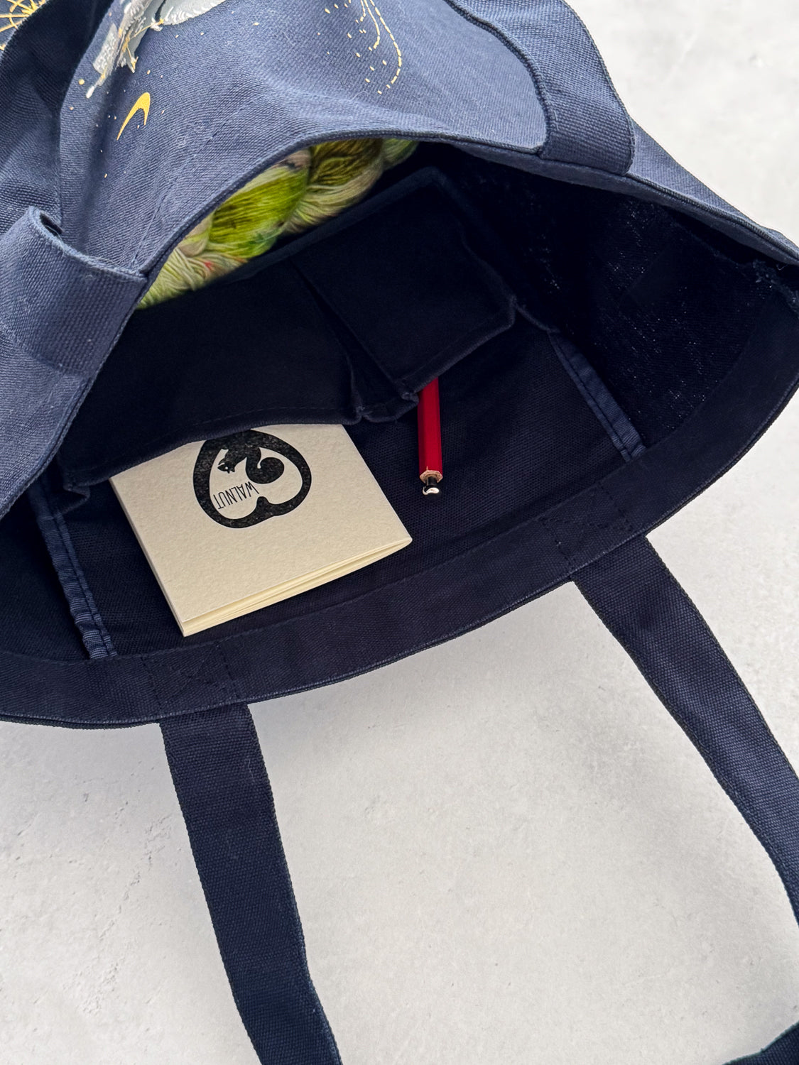 Made of sturdy canvas, it's perfect for everyday shopping or carrying knitting tools.