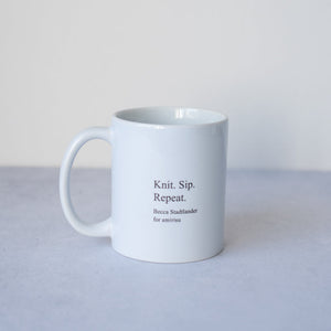 背面には「Knit. Sip. Repeat.」の文字。編み物のお供に、かわいいマグで温かい飲み物を楽しんで。