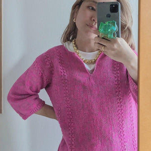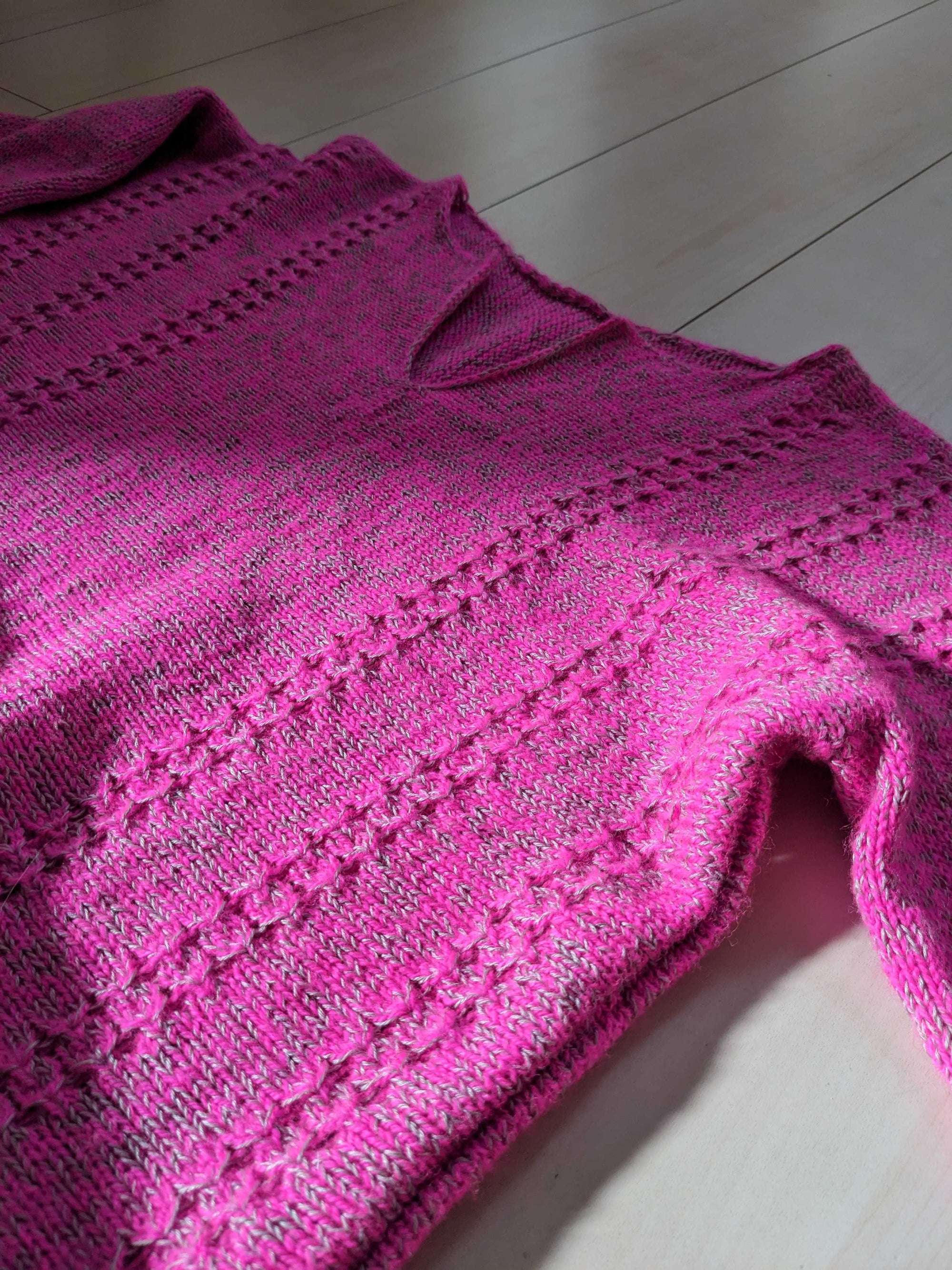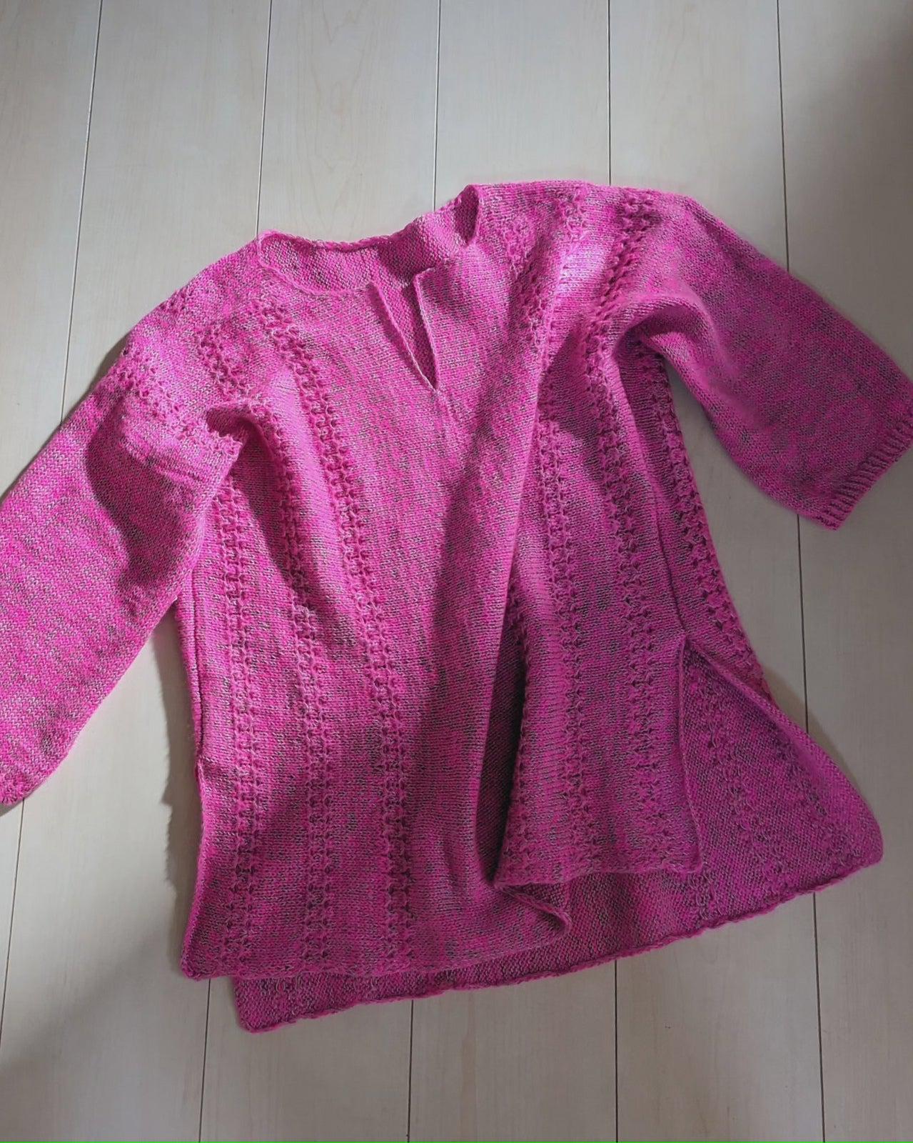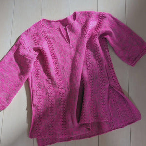 身頃を横から往復編みで編みます。肩にマチを作ることで肩下がりを作ります。前後身頃を分けて編み、前身頃の中心には切り込みが入ります。ネック部分が終わったら再度前後身頃を合わせて編み、マチ部分を減目し、身頃を編み終えます。脇下は後からお好みの長さをとじ、その後袖を拾い目し、袖口に向かって編みます。