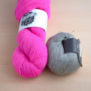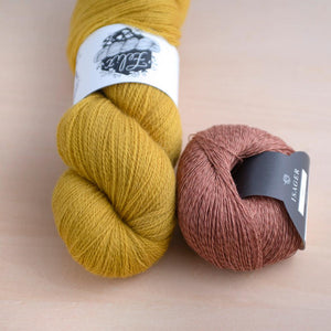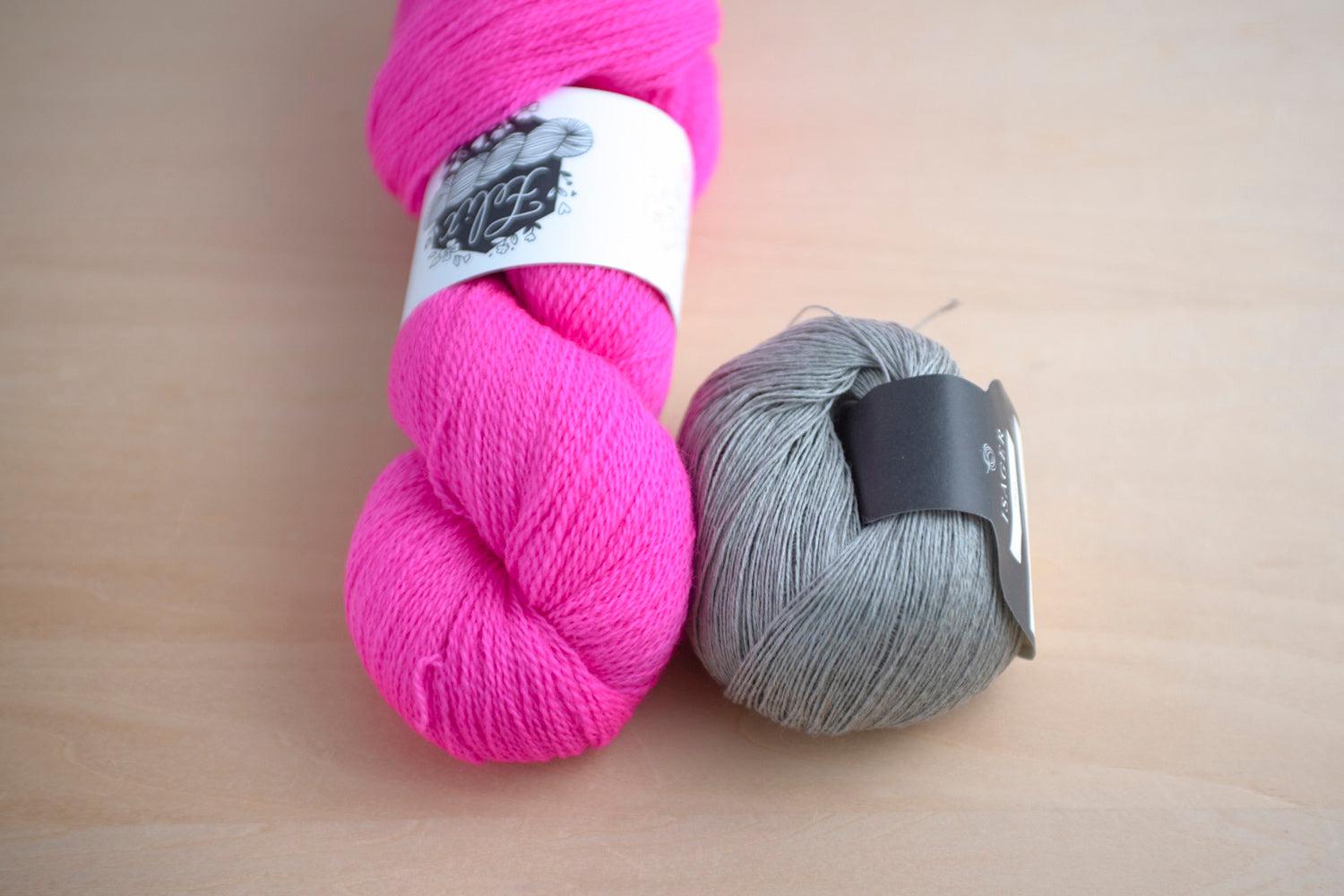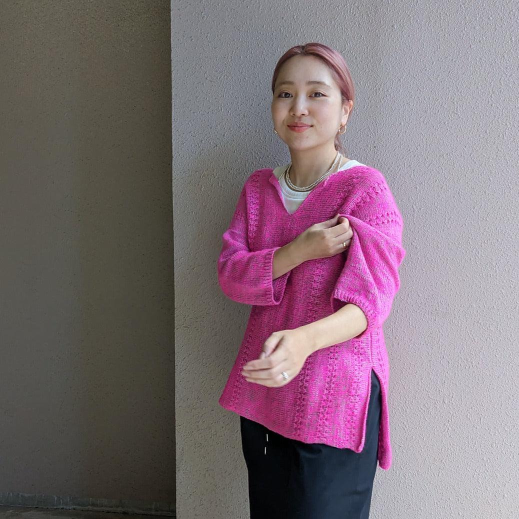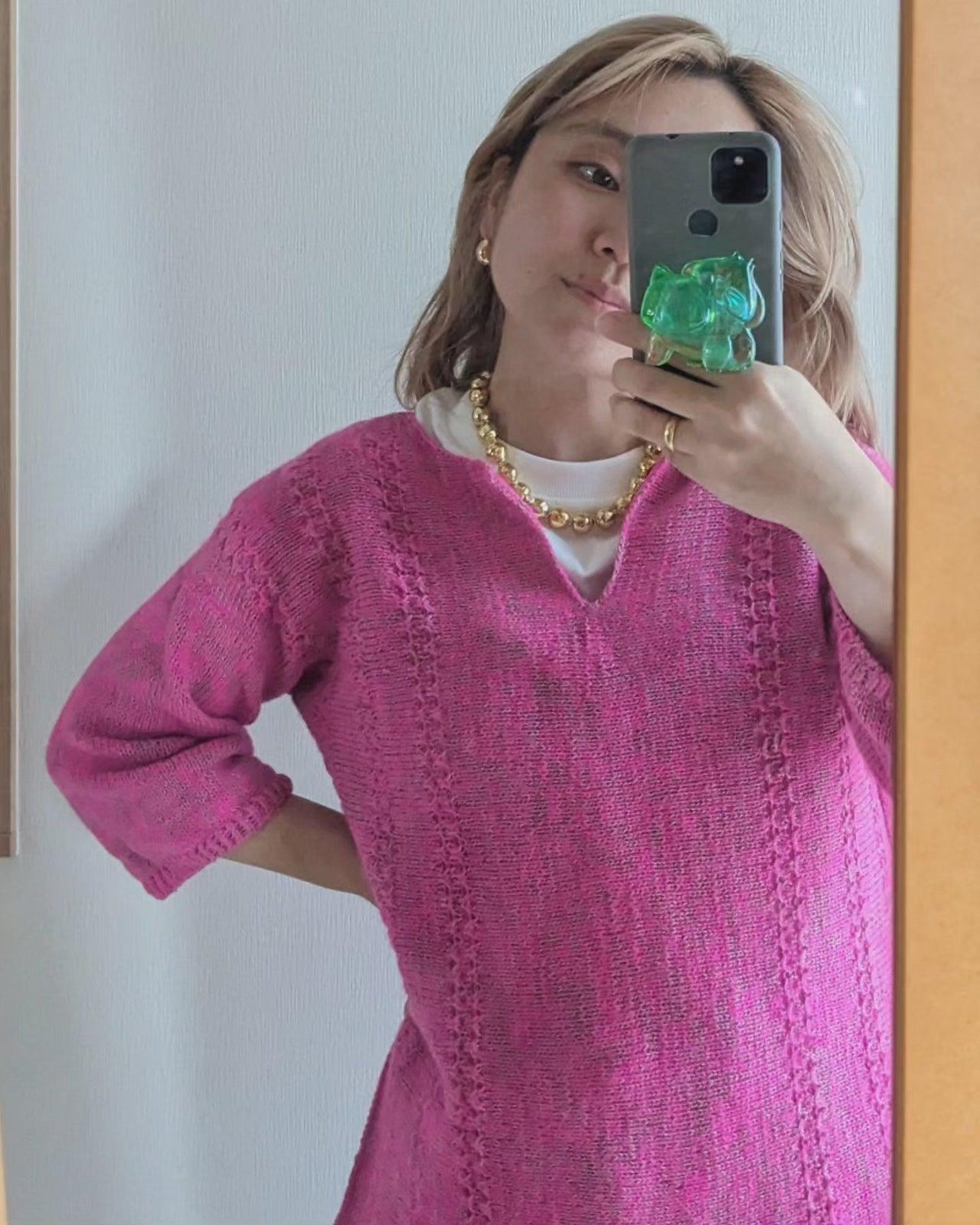 糸はLa Bien Aimée Felix(もしくはHelix)とIsager Trio 1と引き揃えで編みます。素材違いの作るメランジの編み地が美しく、肌触りが良いです。身頃に入る縦のライン(フラワーステッチ)がポイントです。